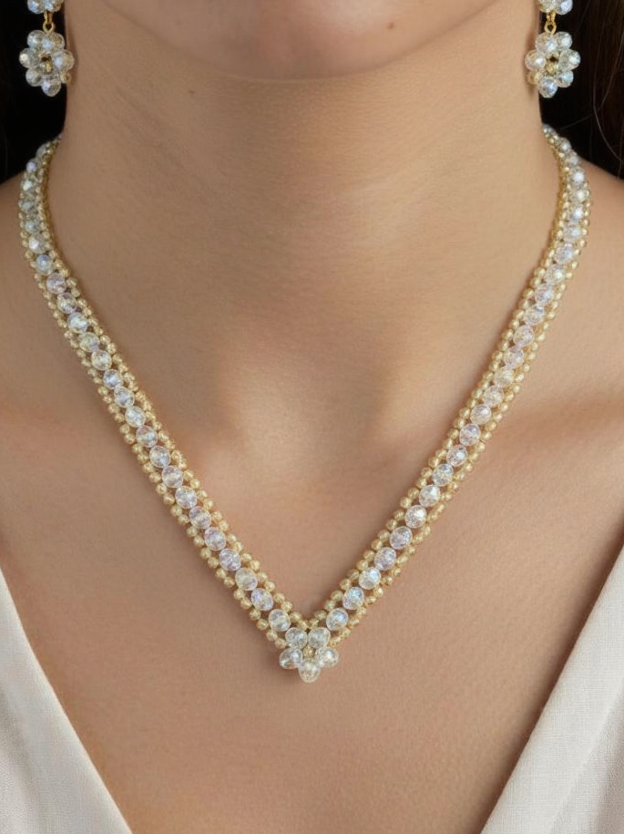 Glow with elegance in the Crystal Beaded Necklace Set and a Bracelet by CHAMMAQ, a mesmerizing blend of soft gold and transparent crystal beads.